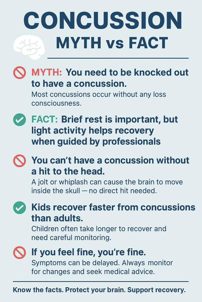 Concussion Myth vs Fact: CT scans cant reliably detect concussions. Children may suffer academic struggles years on after a concussion.